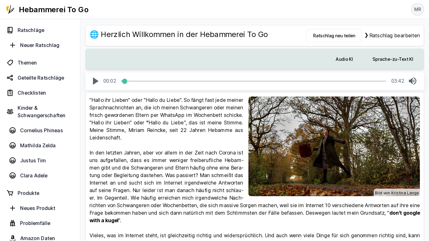 Als Vater von vier Kindern hatten meine Frau und ich das großartige Glück einer großartigen Hebamme: Miriam Reincke. Über die Jahre hat sich der Kontakt von "professionelle Betreuung" über gegenseite Unterstützung bei Nachhilfe und Heizung (ihr Mann ist Klempner) zu "wir machen mal Digitalisierung" gewandelt. Dabei entstand die Hebammerei To Go als Ratschlags-Datenbank für immer wiederkehrende Fragestellungen rund um die Schwangerschaft